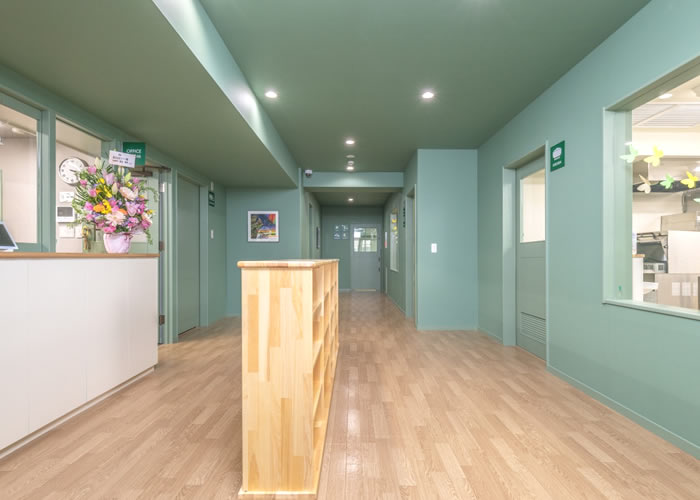 共同住宅の1階ピロティ駐車場をコンバージョンした企業主導型保育園です。低い階高の中、天井面にメリハリをつけることで天井の低さを改善しています。内部の色彩はグリーンをベース色としたアメリカンスタイルのインテリアとなっています。